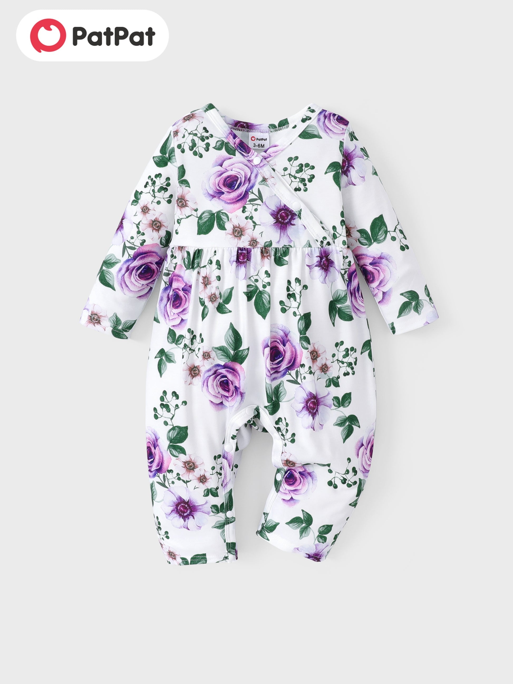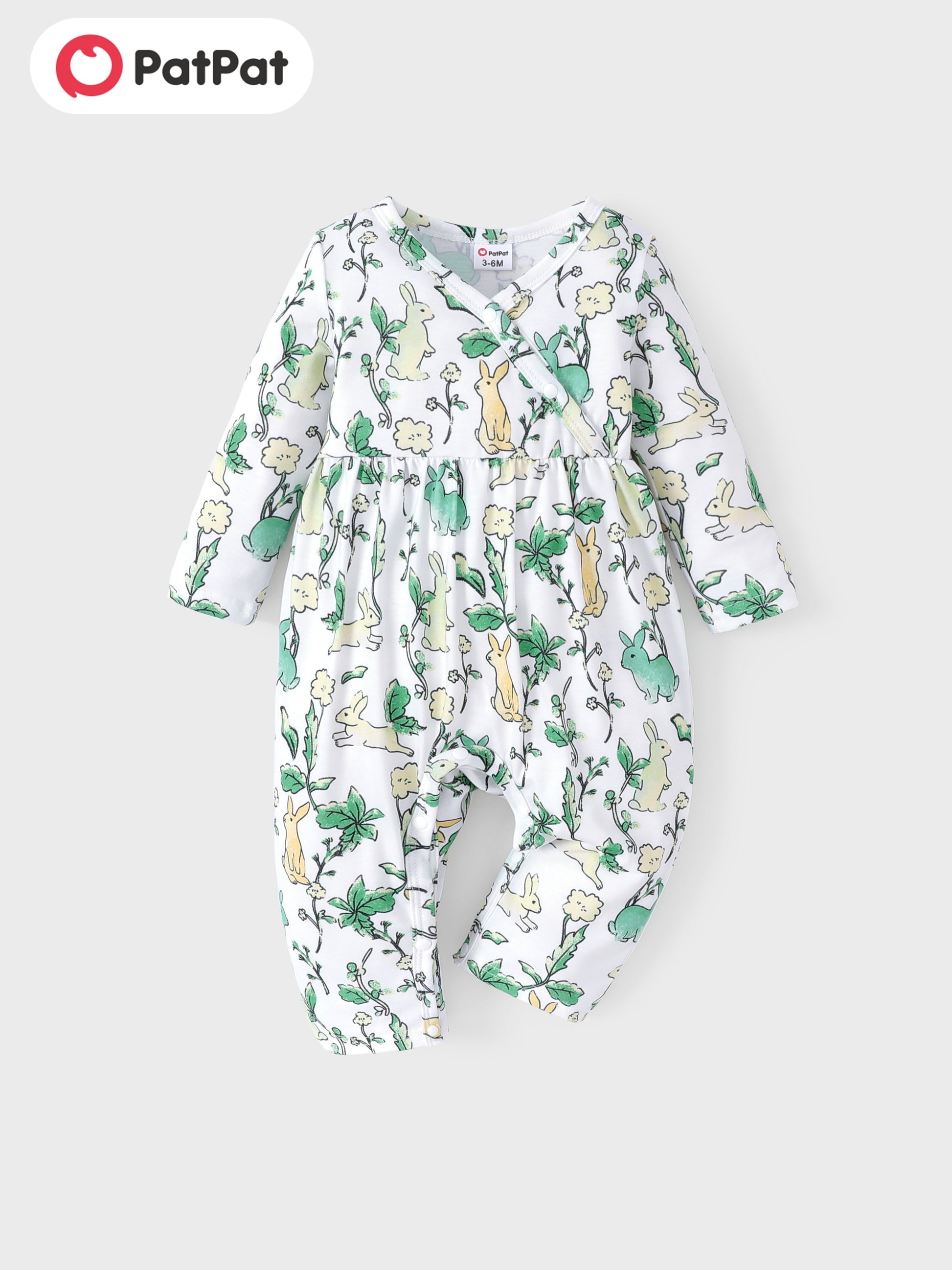 PatPat Baby Girl Cute All Over Rabbit Print/Solid Ribbed V Neck Short-sleeve Jumpsuit For Summer Outdoor Wear